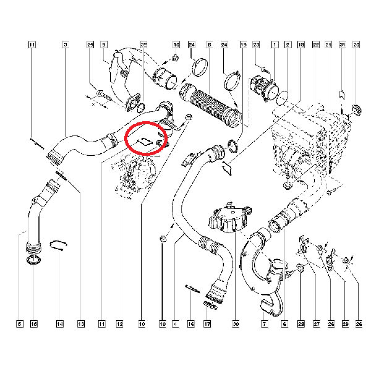Пружна металева скоба для фіксації патрубка інтеркулера для автомобілів Renault Scenic III (Рено Сцінік 3) обладнаних 8-клапанним турбованим двигуном 1.5 Dci (K9K) з датою виробництва в період із 2009 р. по 2016г