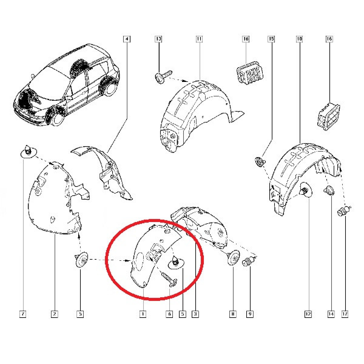 Передня частина лівого переднього підкривання для автомобілів Renault Scenic II (Ріно Сцільник 2), що випускаються з 2003 року до 2009 року.