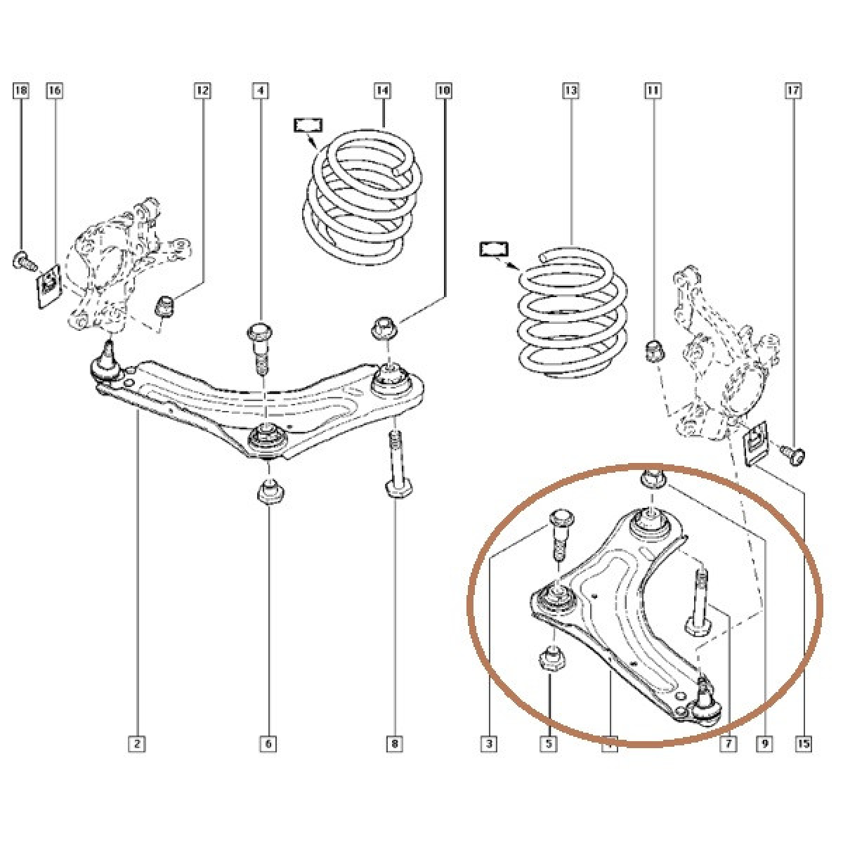 Передній лівий важіль (з сайлентблоками та кульовою опорою) для автомобілів з типом кузова УНІВЕРСАЛ (grandtour) Renault Megane III (Рено Меган 3) випущених у період із 2008 р. по 2016г. На відміну від автомобілів у кузові седан і хітчбек задній сайлентблок переднього важеля — гідравлічний
